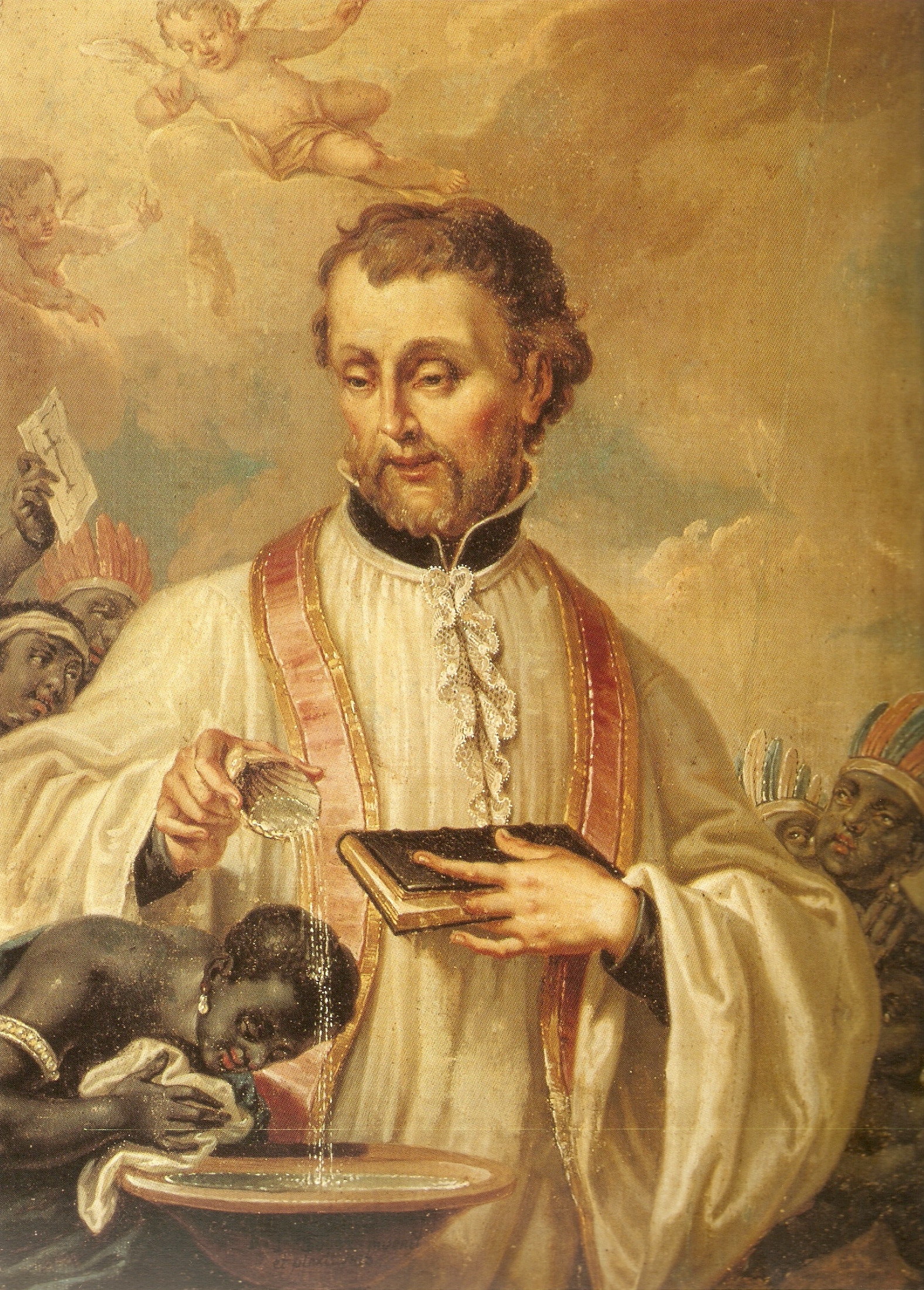esquerda uma bíblia, ao passo que com a mão direita banha