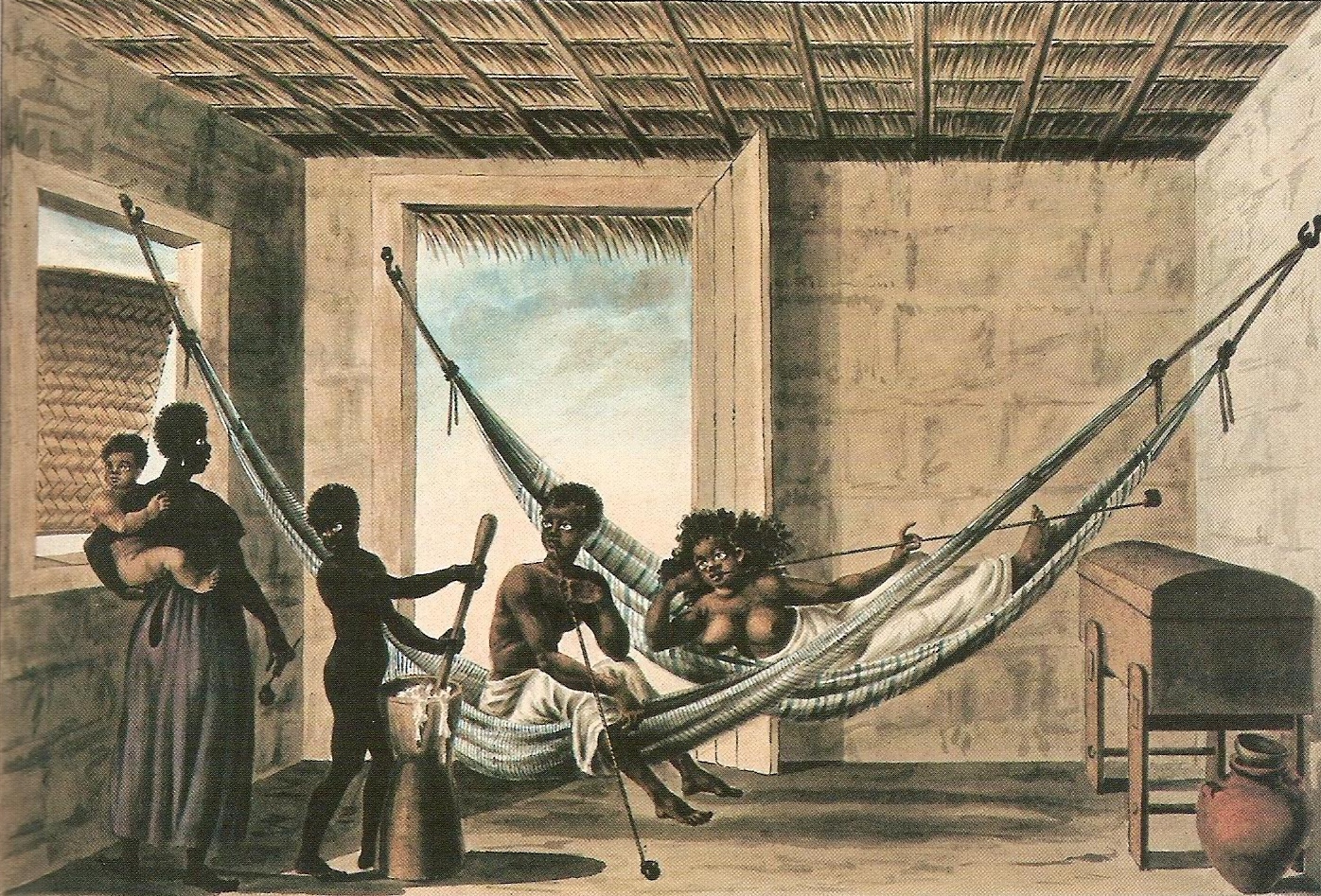 deitados em redes, ambos fumando longos cachimbos. À esquerda